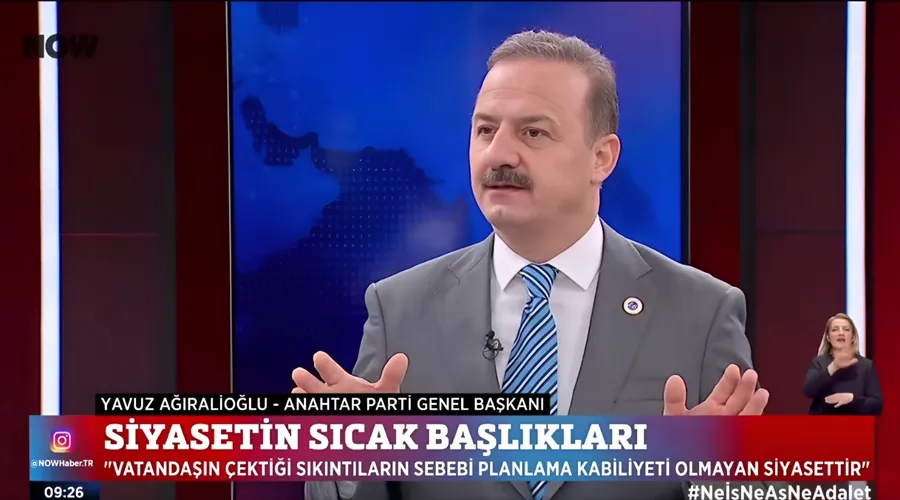 Anahtar Parti Genel Başkanı Yavuz Ağıralioğlu, NOW TV’de İlker Karagöz’ün sunduğu Çalar Saat programının canlı yayın konuğu oldu. Gündeme ilişkin değerlendirmelerde bulunan Ağıralioğlu, özetle şunları söyledi: